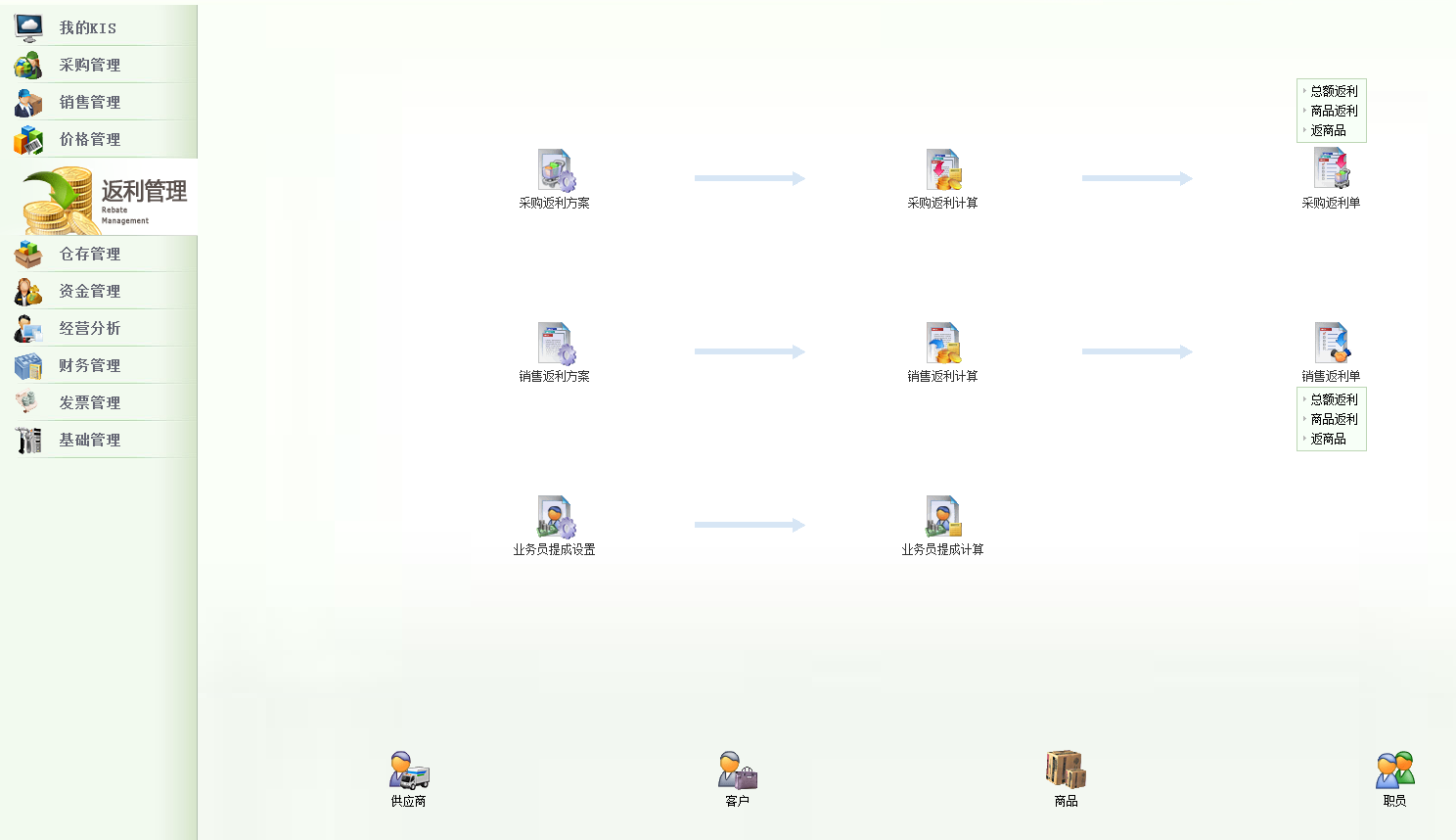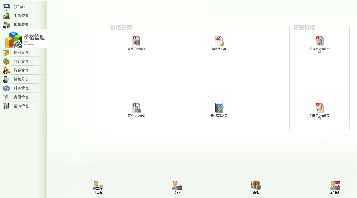 | 金蝶KIS商贸高级版V7.0 | 采购管理 销售管理 价格管理 返利管理 仓存管理 资金管理 财务管理 |