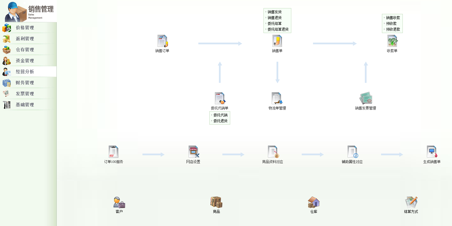 通过对销售订单的跟进、商品的销售/退货分析、商品物流环节的快递单跟踪、商品的毛利分析、商品的最低售价控制、企业销售状况分析以及对客户货款的结算控制等,对企业的销售环节实现全方位管理。系统还支持企业拓展电子商务的需要,可以从主要电商平台自动下载网上订单,自动生成销售单,实现线上线下业务的一体化管理。