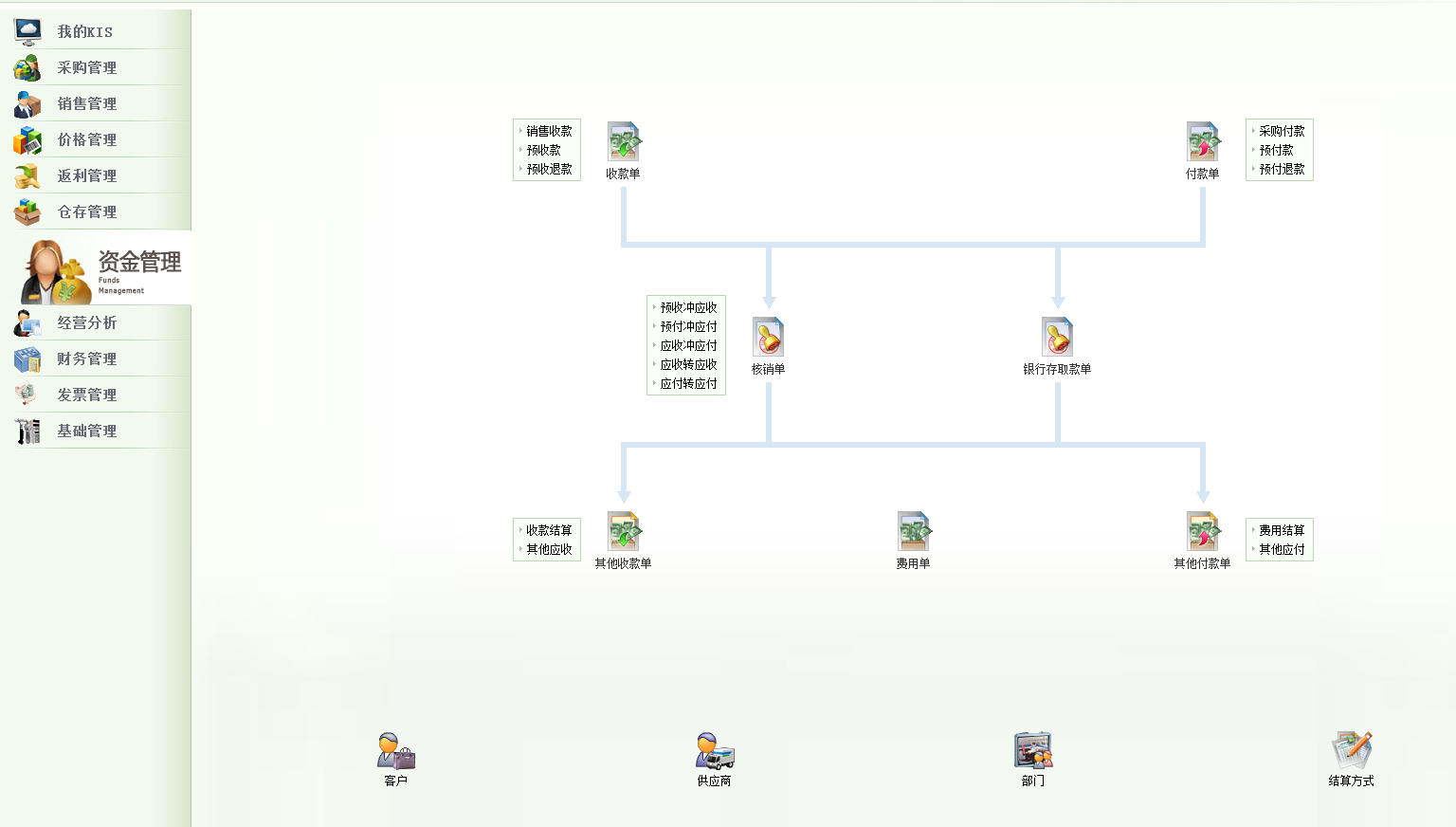 通过对货款、运费、押金、借入借出款以及银行往来等款项的收付记录和控制、往来单位的信用控制、往来单位的款项分析等,对企业的资金实现全方位管理。系统提供多种核销方式,帮助企业准确处理预收、付款核销、三角债务结算、以货抵债、债务转移等业务;其它收付款业务,帮助您有效处理往来间的返点、代垫运费等业务;往来对账业务,帮助您清晰查看同一客户往来间的商品发货记录、实际收款记录。