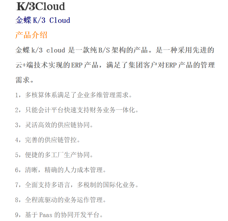 金蝶K/3 Cloud是基于WEB2.0技术与云技术的一个开放式、社会化的新时代企业管理服务平台。对内,金蝶K/3 Cloud打破企业各层级、各部门间的壁垒,使原本割裂的信息聚合一起,全通道式的信息传播得以建立,企业内部的交互变得更自由、更顺畅,充分提高企业内部协作效率;对外,金蝶K/3 Cloud打通了企业间的边界,通过开放的平台让企业与客户、合作伙伴、及至员工社群建立更紧密的联系,实现企业间的资源共享,经验互利,让产业链更协同、更敏捷。 这是一个中国经济触底的时刻。但是,这也是IT技术引领全球大尺度进行第三次科技革命的伟大时代。颠覆传统,抓住机遇。金蝶K/3 Cloud将帮助中国制造企业顺利转型、塑造云管理时代的核心竞争力。