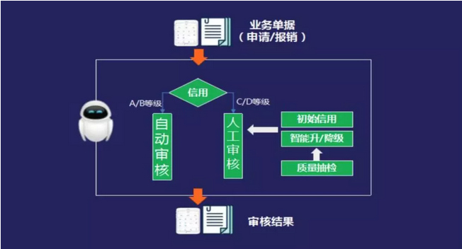 企业应该在系统中设置信用等级,一般将员工等级分为A、B、C、D类;对于信用等级为A、B类的员工,提起的业务单据(费用报销单或费用申请单)通过系统自动审核;对于信用等级为C、D类的员工,提起的费用报销单则需要财务共享中心的审核人员手工审核。结合流程抽检,极大的提升财务审单的效率。