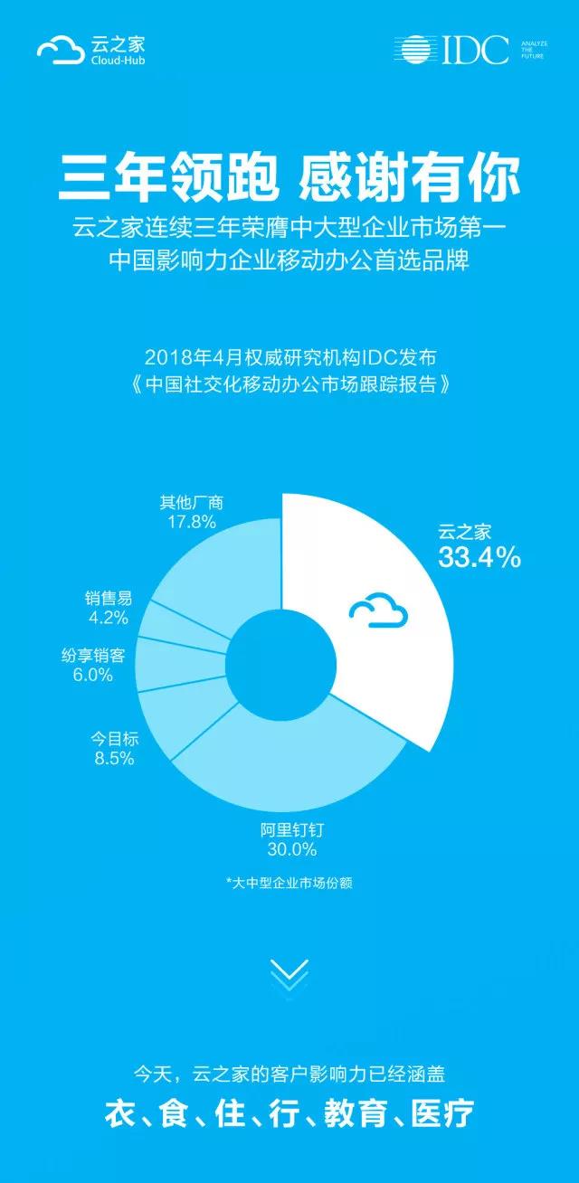 4月3日,最新 IDC报告于北京权威发布。2017年,在大中型企业市场(企业员工人数在250 人以上),从产品的企业用户数量来看,金蝶云之家以33.4%的市场份额占据首位,连续三年引领市场。阿里钉钉和今目标分别以30.0%和8.5%排在第二、三位。